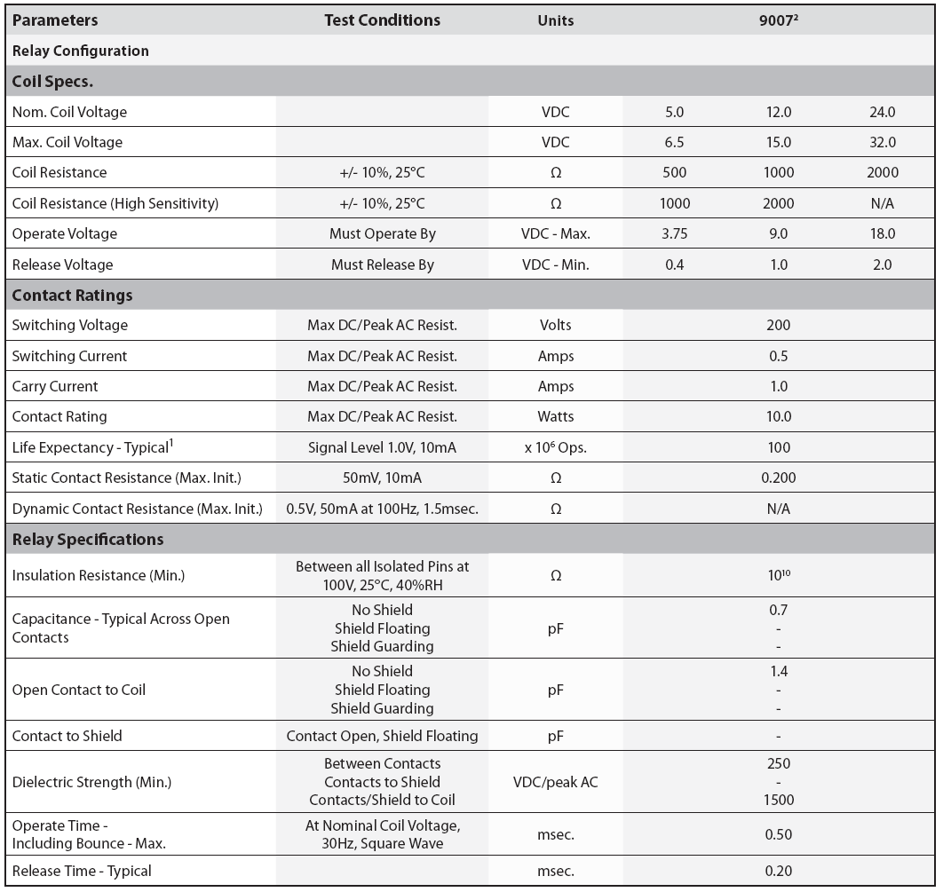 The SIP relay is the industry choice for a wide variety of designs where economy, performance and a compact package are needed. The 9007 Spartan Series is a general purpose economy version of the 9001 for applications with less stringent requirements. These relays are well suited for applications in Security, Instrumentation and Modems. Consult the specification tables in the parametric search tool on the General Product Page to help in selecting the appropriate relay for your application.