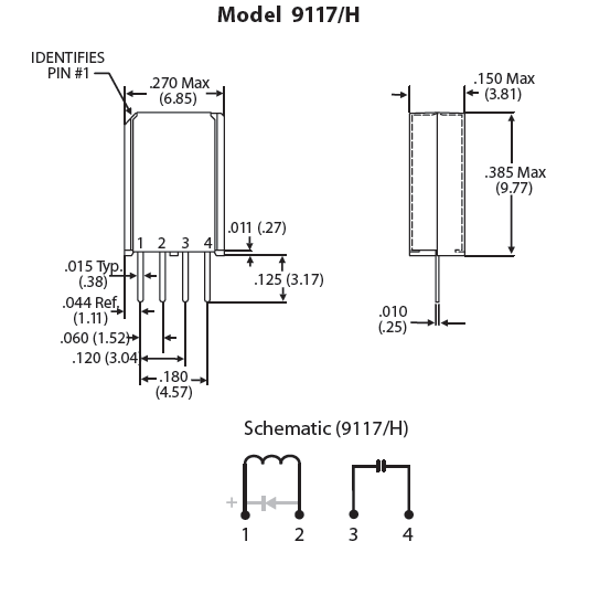2Optional diode available. For models 9011 & 9012, the diode is connected to pin #2 (cathode) and pin #3 (anode). For models 9117 & 9117H, the diode is connected to pin #1 (cathode) and pin #2 (anode). Correct coil polarity must be observed.