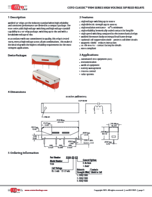 Any product, process or technology in this document may be the subject of patents or other intellectual property rights reserved by Coto Technology, Inc. or its affiliates and subsidiaries, and may not be licensed hereunder. The Coto Logo and the brick red color of reed relays and magnetically operated encapsulated reed switches manufactured by Coto are Registered Trademarks of Coto Technology Inc. All other product names, trademarks, registered trademarks, service marks or registered service marks, mentioned throughout any part of this publication belong to their respective owners.
